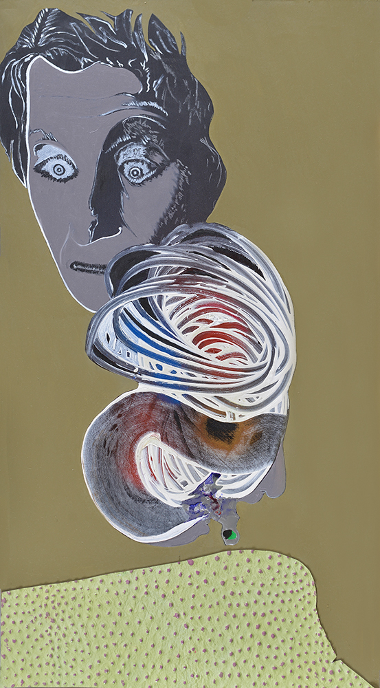 Foto di Copertina: Shut up ! smalto, pelle, specchio e cartoncino su tessuti vari 131×160 cm anno 2024
