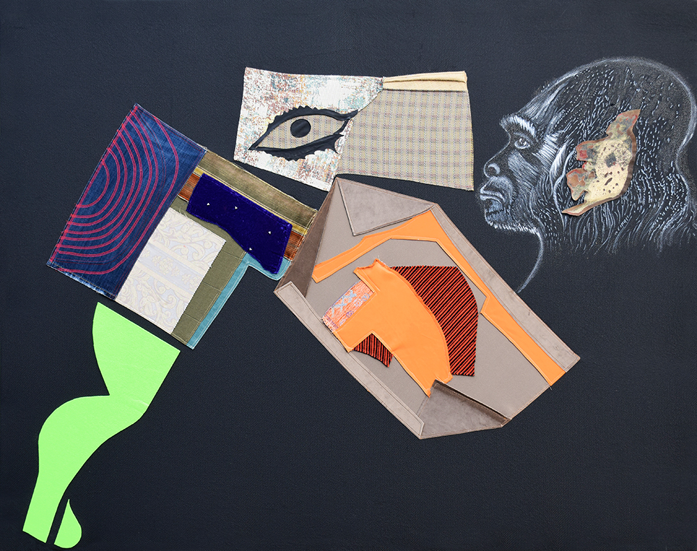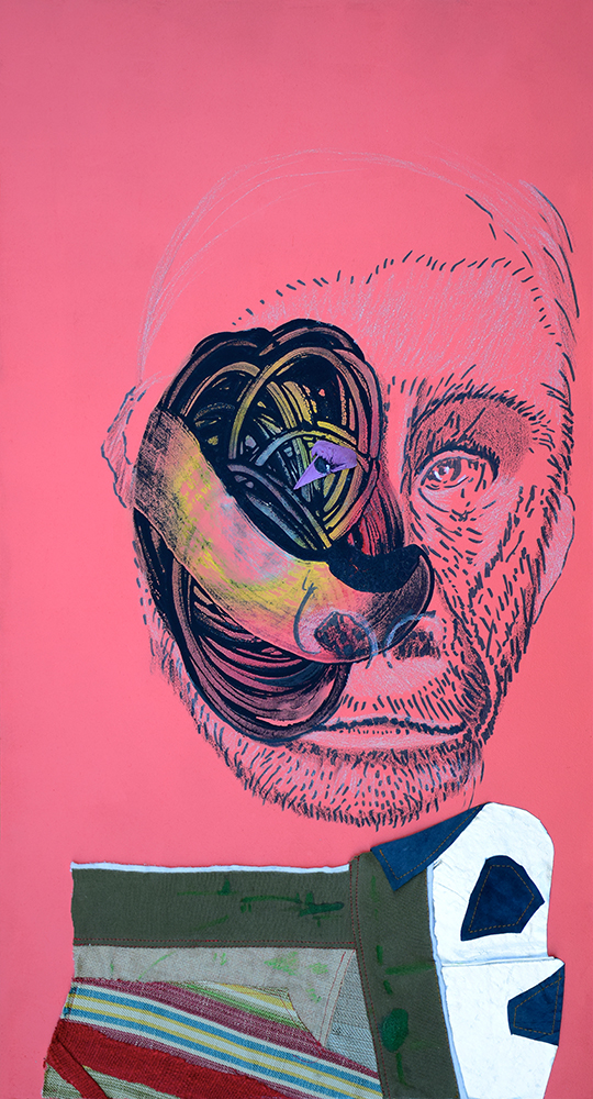 Tale pratica riflette profondamente la processualità e il linguaggio artistico di un autore perennemente in bilico tra personale e universale, persona e maschera, e nell’opera tra segno, colore ed elementi assemblati. Se la sua poetica si fonda sul linguaggio pittorico, la sua vivacità tecnica lo porta a sperimentare materiali plurali, anche di riuso. La scelta e l’impiego di stoffe riciclate immette nell’opera il valore aggiunto della presenza di reminiscenze recondite alle quali l’artista offre nuova vita attraverso un patchwork visionario obbediente a un caos misurato, trame che l’artista compone pazientemente con la macchina da cucire.