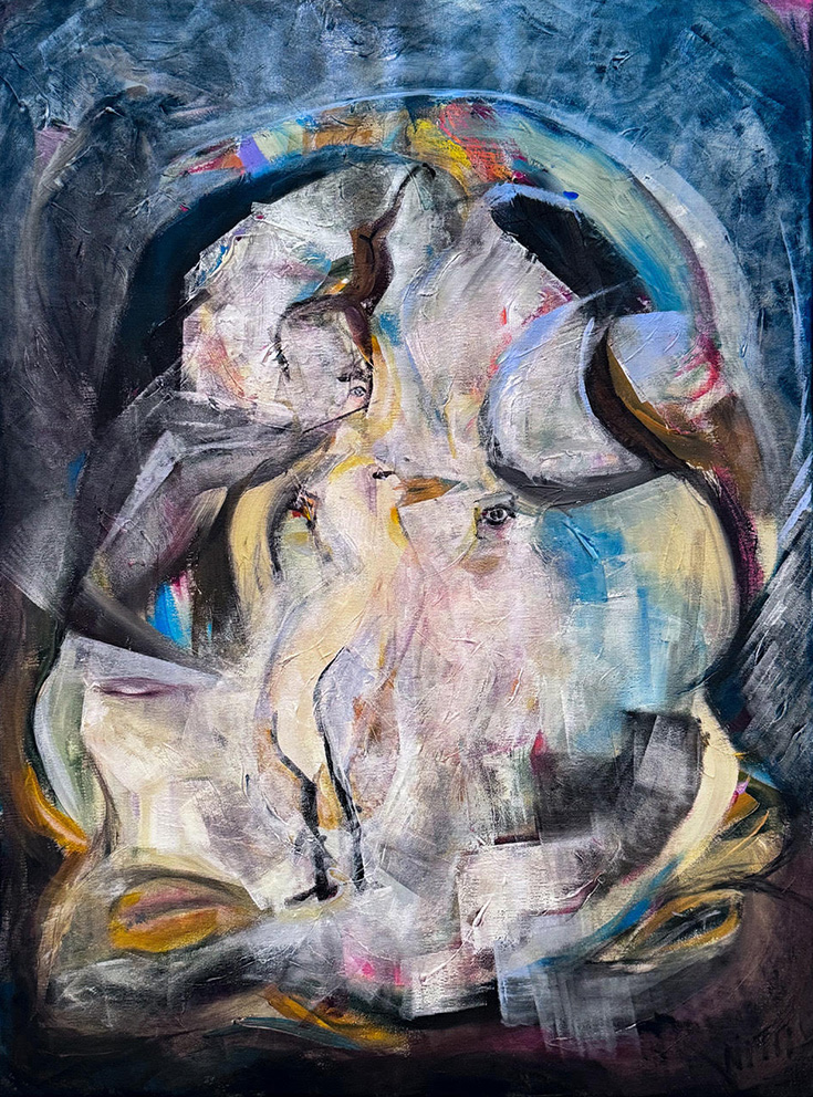 Ventisei le opere di Donato Nitti, primo artista fiorentino ad esporre alle Giubbe Rosse dopo la riapertura del giugno scorso, in una collezione che combina 14 opere digital art stampate su tela e su carta e 12 di pittura, tra acrilici e acquerelli. Tra di esse una rende omaggio al maestro Jean Michel Folon, un artista che aveva un rapporto speciale con Firenze. “Amo molto Folon, e quando nel maggio scorso è stato organizzato il concorso fotografico “Folon: tra sogno e realtà” non potevo non partecipare. Una delle mie opere fu selezionata tra le finaliste e oggi ho l’onore di poterla esporre con l’autorizzazione della Fondation Folon, che desidero ringraziare pubblicamente”. Altre opere traggono ispirazione da grandi del passato come Rosai, Modigliani, Boccioni, Balla, in una ricerca continua. Tra i sentieri che l’esplorazione di Nitti percorre, uno lo conduce all’uso artistico dell’IA, generando volti che poi l’artista reinterpreta nella sua pittura, ma senza mai usarla nelle opere di arte digitale.