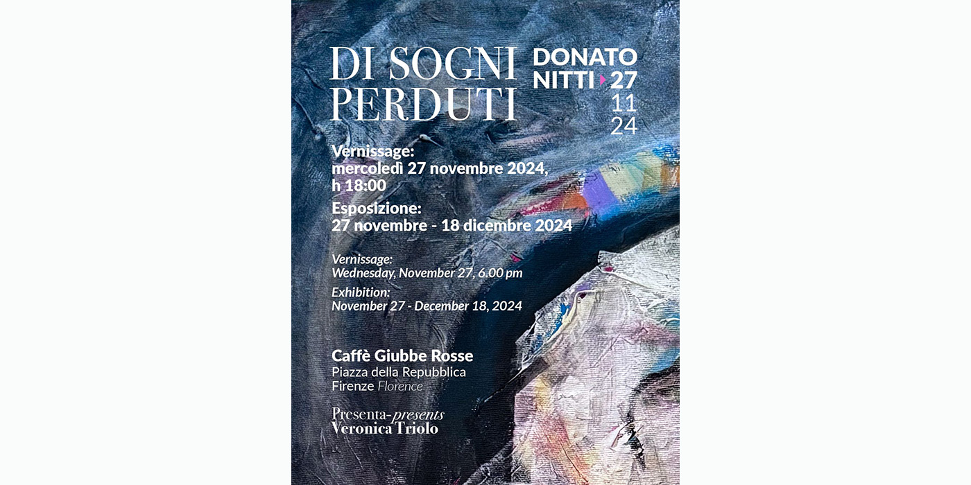 Uno “spicchio” colorato e appassionante sulla vita di un artista, pittore e poeta, che ne svela al contempo la rara cultura e delicata sensibilità. “Di sogni perduti” è il titolo del libro di poesie, uscito per Bertoni editore l’11 novembre, di Donato Nitti, che dà anche il tema alla sua personale al Caffè letterario Giubbe Rosse di Firenze. Il vernissage, su invito, aprirà al pubblico mercoledì 27 novembre alle 18 e per l’occasione Nitti esporrà anche opere di ispirazione futurista, omaggio ad uno dei luoghi dell’arte del Novecento. La mostra sarà visitabile fino al 18 dicembre.