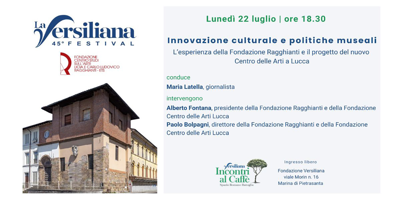 Lunedì 22 luglio alle ore 18:30 la Fondazione Ragghianti di Lucca per il quinto anno consecutivo sarà ospite del Festival La Versiliana per un “Incontro al Caffe” dal titolo “Innovazione culturale e politiche museali. L’esperienza della Fondazione Ragghianti e il progetto del nuovo Centro delle Arti a Lucca”.