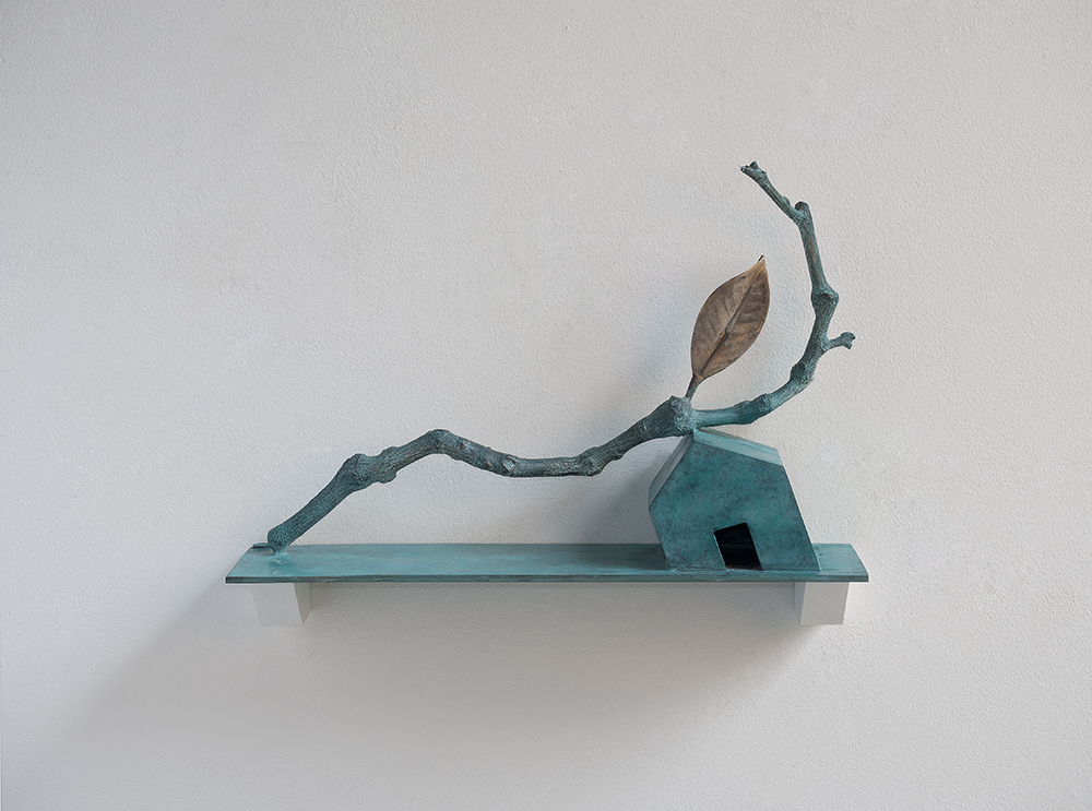 Sia nei dipinti su carta che nelle sculture in bronzo ricorre, ad esempio, la forma archetipa della casa, posta in dialogo con il biomorfismo dei rami che fuoriescono dal tetto o dalle finestre. Non un processo metafisico, ma l’interiorizzazione di situazioni reali, osservate dall’artista nel corso delle sue camminate in natura.