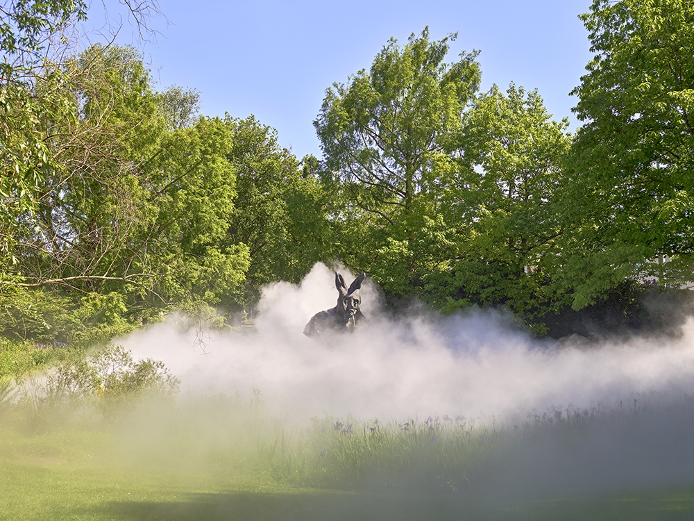 Thomas Schütte, Hase, 2013, Bronzo, patinato; Fujiko Nakaya, Senza titolo, 2024, Acqua potabile, 600 ugelli Meefog, Sistema motore con pompa ad alta pressione, Courtesy dell’artista