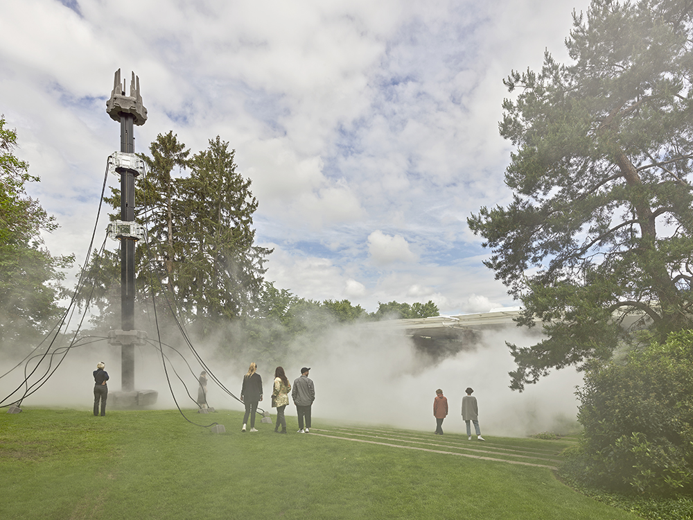 Philippe Parreno, Membrana, 2023, Struttura cibernetica con capacità sensomotorie ed elaborazione generativa del linguaggio, cortesia dell’artista © Philippe Parreno; Fujiko Nakaya, Senza titolo, 2024, Acqua potabile, 600 ugelli Meefog, Sistema motore con pompa ad alta pressione, per gentile concessione dell’artista, © Fujiko Nakaya