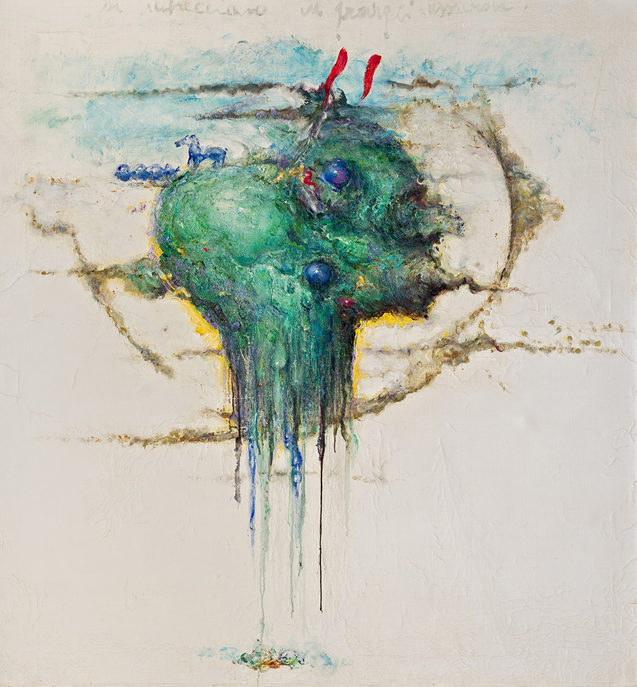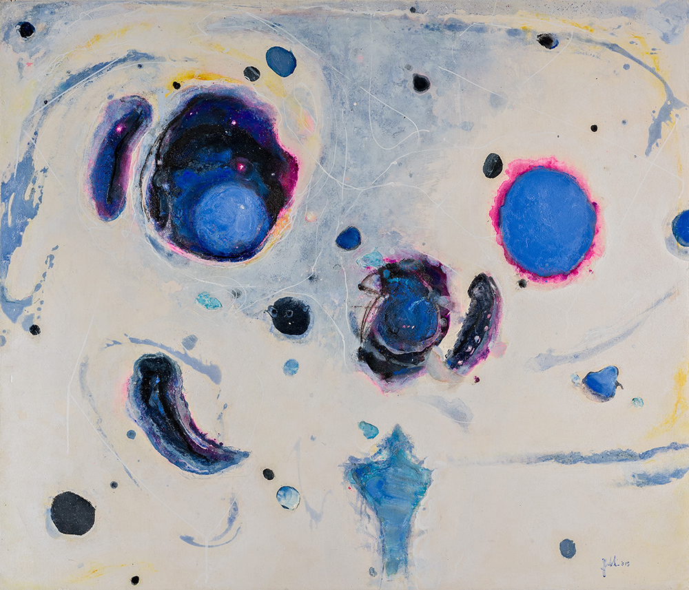 “Una serie di opere misteriosa, materica e colorata”, scrive Martina Corgnati. “Fondi densi e spessi, dall’apparenza gelatinosa e mobile, sui quali galleggiano corpi ameboidi e in cui si dischiudono bolle che rivelano spazi intrinseci, oscuri, da cui emergono corpi tondeggianti altrettanto molli, spesso prominenti, non vere e proprie macchie ma globuli organici, come di mondi in formazione”.