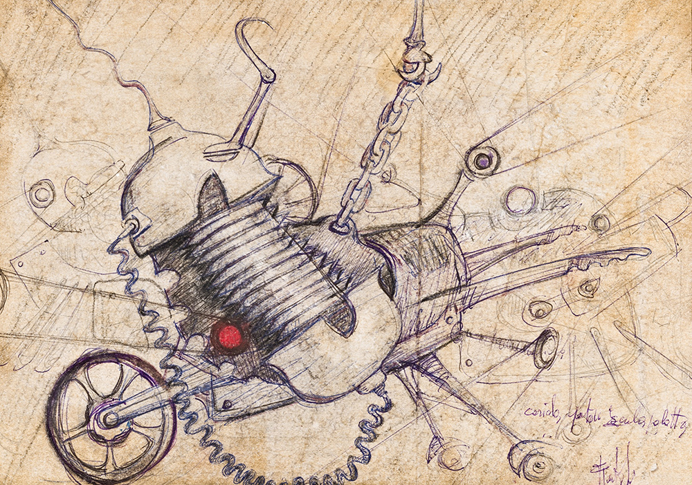 Negli anni Settanta e Ottanta, l’artista lavora, infatti, a paesaggi ibernati, costruzioni autogeneranti, animali meccanici, erotismi metallici, città ideali plastificate ed elettriche, installazioni e sculture, ma anche a cartelle di disegni e grafiche caratterizzate da perfezione tecnica e attenzione al dettaglio. La stessa cura che l’artista riserva ai bozzetti: più che schizzi, veri e propri progetti ingegneristici, funzionali alla meccanizzazione delle sue sculture, molte delle quali pensate per l’esterno.