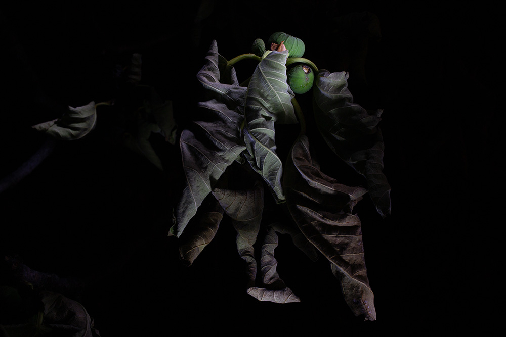 Le fotografie delle piante sofferenti, restituite dall’obiettivo di Morini con tratti drammatici e quasi caravaggeschi, grazie anche alla tecnica del light painting, portano il pubblico a riflettere su quanto piccole azioni quotidiane, come il commercio globale o il trasporto di merci, possano innescare trasformazioni profonde in sistemi complessi come l’ecosistema. Un insetto apparentemente insignificante, come l’Aclees taiwanensis, il punteruolo nero, trasportato accidentalmente in Italia, ha il potere di distruggere alberi di fico che per generazioni sono stati parte integrante della cultura e del paesaggio. Il delicato equilibrio del sistema, costruito nel tempo dalle famiglie che innestavano i loro alberi, può essere spazzato via da questo piccolo cambiamento apparentemente lontano.