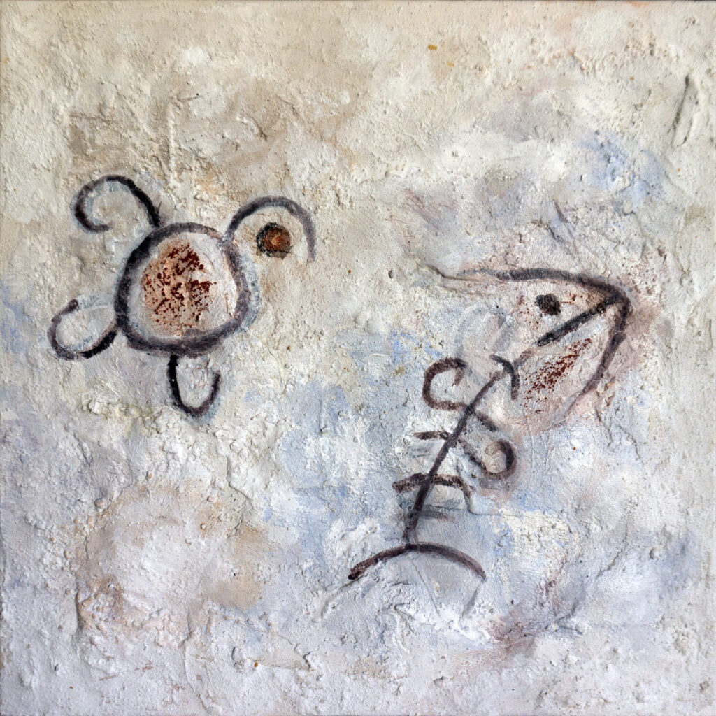 Molto suggestiva è la storia delle opere in mostra presso Theoria. Esse hanno infatti origine da uno scavo archeologico dell’Università di Ferrara, nella grotta di Fumane (VR), dove sono state rinvenute cinque pietre dipinte 40mila anni fa da un uomo preistorico. Con esse, vi era un ingente quantitativo di pigmenti, utilizzati dall’artista delle caverne per dipingere le cinque pietre rinvenute. L’Università di Ferrara ha consegnato ad Andrea Benetti una parte di questi pigmenti, con i quali ha creato un ciclo di opere utilizzando i colori del suo “collega” del Paleolitico.