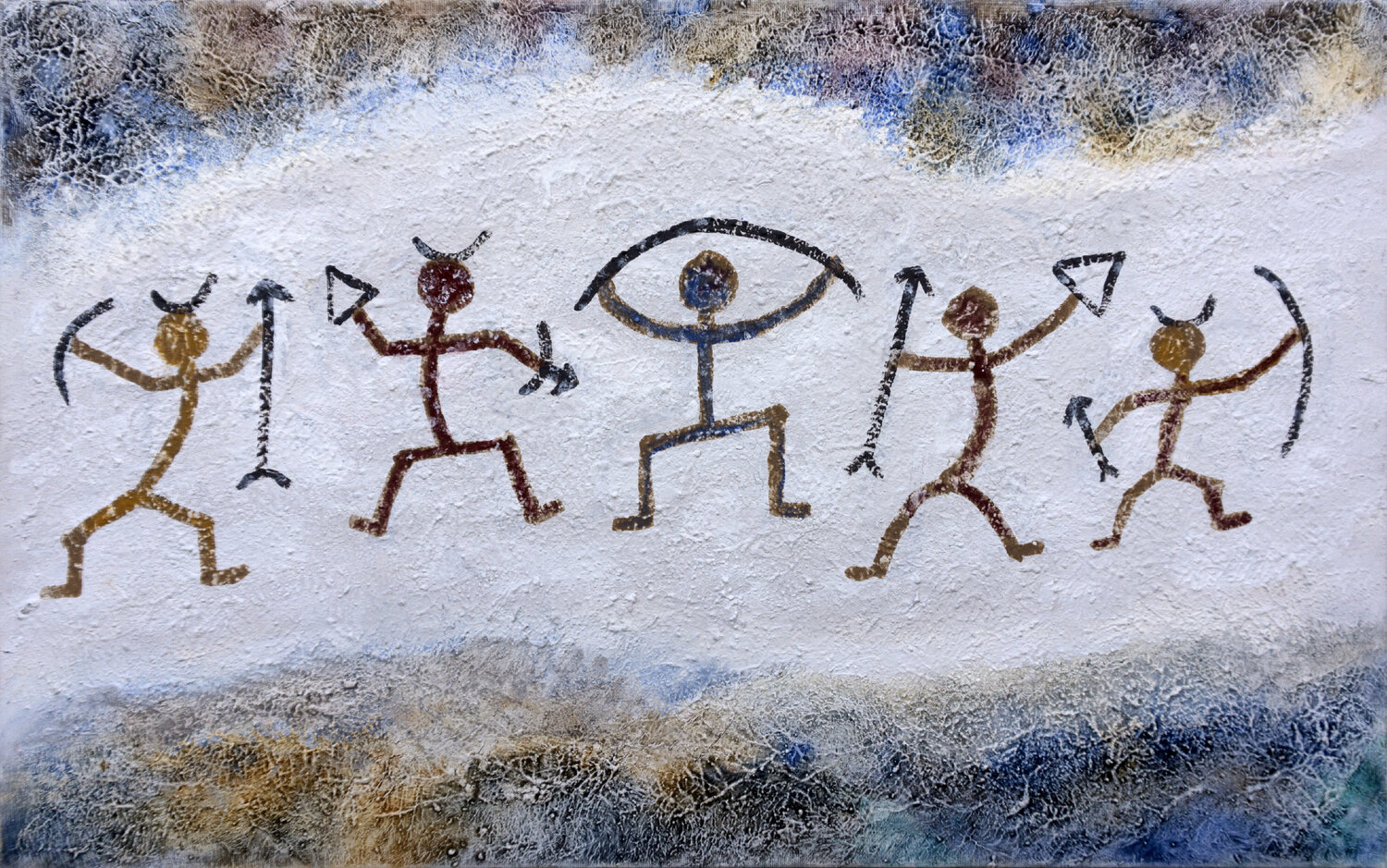 Le opere di Andrea Benetti (in alto Lo Sciamano Blu), realizzate con pigmenti di 40mila anni fa, rinvenuti nella grotta di Fumane (VR) insieme a cinque pitture rupestri su pietra, instaurano un dialogo, che evidenzia le similitudini tra la comunicazione visuale della Preistoria e l’odierno linguaggio digitale, creando un ponte ideale tra l’artista del Terzo Millennio e il suo “collega” del Paleolitico.