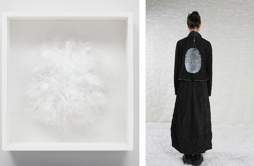 L’impronta di Manzoni (estratta dall’opera Uovo scultura, 1960) viene ripresa in tutto il suo rituale di concetto e riproposta con timbri eseguiti dalla stessa designer all’interno di giacche e gilet/abiti con l’intento di ripetere il gesto manzoniano della timbratura a mano. La scrittura stessa di Manzoni ispira Maria Calderara generando un pattern che si sfuma e si fonde cromaticamente; indossare i suoi appunti progettuali è come recitare un mantra salvifico.