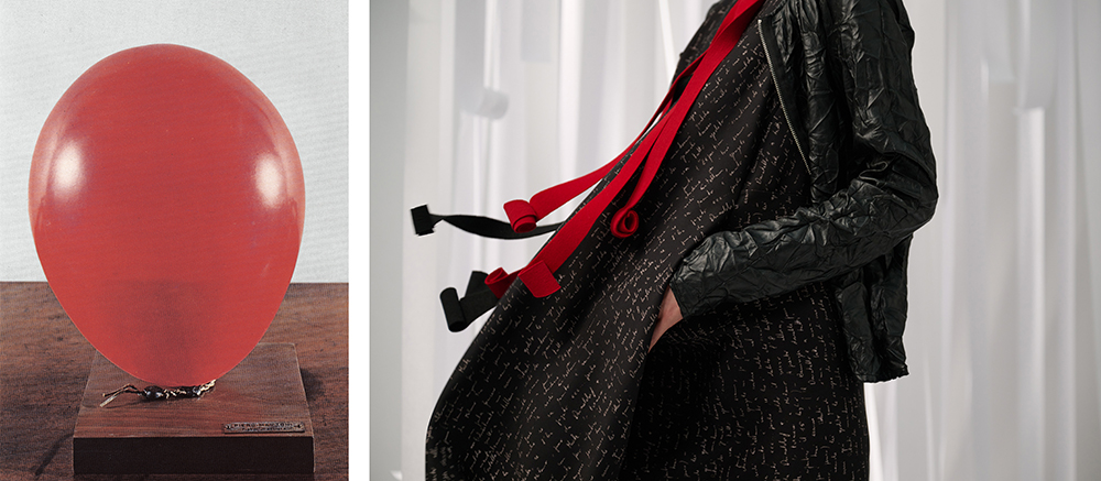 La nuova collezione – #U_TOUCH2 – sembra rispondere alla prima completandola attraverso l’analisi di ulteriori elementi dell’opera del grande maestro italiano. È così che i frammenti di un palloncino scoppiato cuciti su di un collo-sciarpa in feltro divengono un omaggio al famoso Fiato d’artista manzoniano; un segmento di tessuto in lana che sembra svolazzare dalla sommità della manica di una giacca diviene un invito ad indossare nel quotidiano l’idea delle Linee, opere richiamate anche nelle collane in movimento dove linee in feltro si arrotolano e si sovrappongono creando un gioco dinamico e imprevisto.