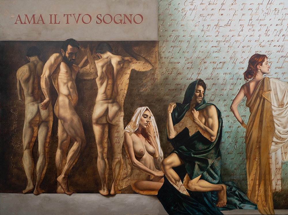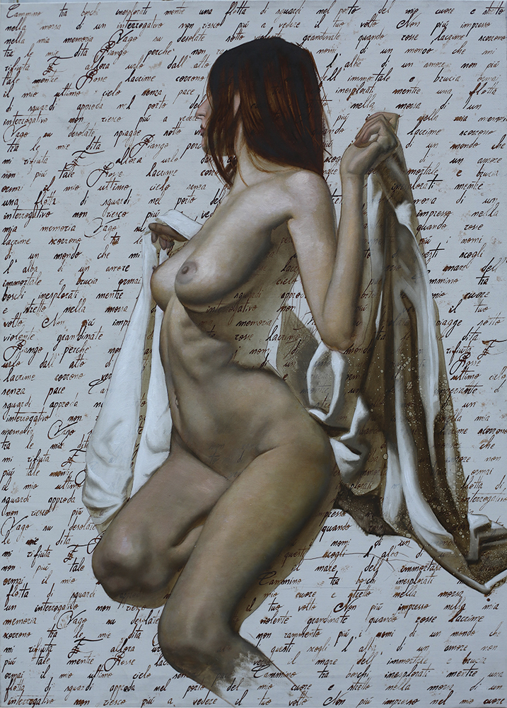 Si tratta per lo più di nudi artistici, realizzati in inchiostro ferrogallico e olio su lino o su tela, oppure su carta blu. Opere essenziali e pulite che, nel presentare una figura singola in un campo fitto di scrittura, offrono lo spunto per riflettere sul rapporto millenario tra pittura e scrittura. Un rapporto, sempre vivo e in continuo mutamento, che si sostanzia in molteplici e variegate forme di relazione e di dialogo, sia formali che sostanziali.