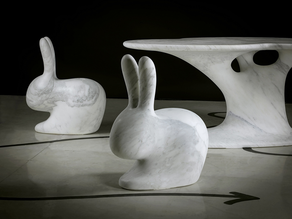 Tree Table+Rabbit Chair was designed by Stefano Giovannoni and made by Robot City in 2014 for the Salone del Mobile Furniture Fair. It is a marble installation consisting of the phytomorphic table and zoomorphic rabbit-shaped chairs. Combining the playful/narrative dimension and functionality, over time Tree Table + Rabbit Chair have been transformed into a whole line of products with strong mediatic communication potential, Queeboo.